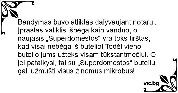 Bandymas buvo atliktas dalyvaujant notarui. Įprastas valiklis išbėga kaip vanduo, o naujasis „Superdomestos“ yra toks tirštas, kad visai nebėga iš butelio! Todėl vieno butelio jums užteks visam tūkstantmečiui. O jei pataikysi, tai su „Superdomestos“ buteliu gali užmušti visus žinomus mikrobus!