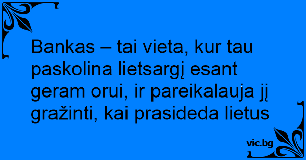 Bankas – tai vieta, kur tau paskolina lietsargį esant geram orui, ir pareikalauja jį gražinti, kai prasideda lietus