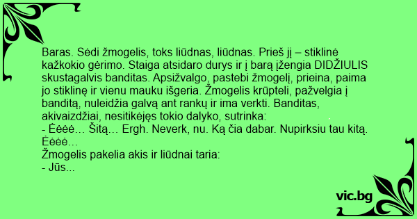 Baras. Sėdi žmogelis, toks liūdnas, liūdnas. Prieš jį – stiklinė kažkokio gėrimo. Staiga atsidaro durys ir į barą įžengia DIDŽIULIS skustagalvis banditas. Apsižvalgo, pastebi žmogelį, prieina, paima jo stiklinę ir vienu mauku išgeria. Žmogelis krūpteli, pažvelgia į banditą, nuleidžia galvą ant rankų ir ima verkti. Banditas, akivaizdžiai, nesitikėjęs tokio dalyko, sutrinka: