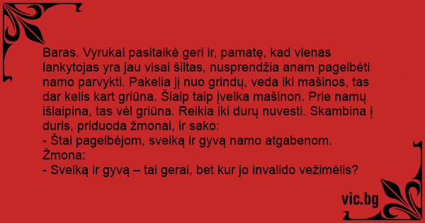 Baras. Vyrukai pasitaikė geri ir, pamatę, kad vienas lankytojas yra jau visai šiltas, nusprendžia anam pagelbėti namo parvykti. Pakelia jį nuo grindų, veda iki mašinos, tas dar kelis kart griūna. Šiaip taip įvelka mašinon. Prie namų išlaipina, tas vėl griūna. Reikia iki durų nuvesti. Skambina į duris, priduoda žmonai, ir sako: