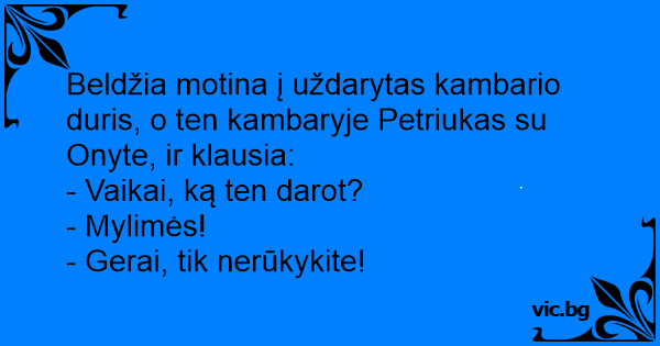 Beldžia motina į uždarytas kambario duris, o ten kambaryje Petriukas su Onyte, ir klausia: