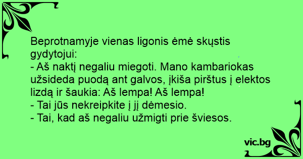 - Aš naktį negaliu miegoti. Mano kambariokas užsideda puodą ant galvos, įkiša pirštus į elektos lizdą ir šaukia: Aš lempa! Aš lempa!