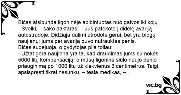 - Sveiki, – sako daktaras. – Jūs patekote į didelę avariją autostradoje. Didžiąja dalimi atrodote gerai, bet yra blogų naujienų: jums per avariją buvo nutrauktas реnis.