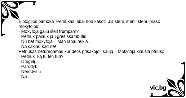 Biologijos pamoka. Petriukas labai nori kakoti. Jis steni, steni, steni. praso mokytojos: - Mokytoja galiu išeit trumpam? - Petriuk palauk jau greit skambutis. - Nu bet mokytoja... Man labai reikia... - Na sakiau,kad ne! Petriukas neturėdamas kur dėtis prikakojo į saują... Mokytoja klausia ptriuko: - Petriuk, ką tu ten turi? - Drugelį. - Parodyk. - Nerodysiu. - Na parodyk... - Na gerai. va išskrido. bet kiek daug prišiko....