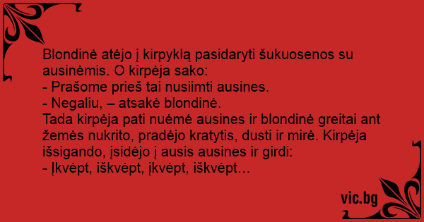 Blondinė atėjo į kirpyklą pasidaryti šukuosenos su ausinėmis. O kirpėja sako: