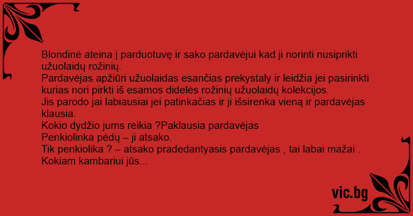 Blondinė ateina į parduotuvę ir sako pardavėjui kad ji norinti nusiprikti užuolaidų rožinių.