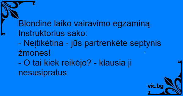 Blondinė laiko vairavimo egzaminą. Instruktorius sako:
