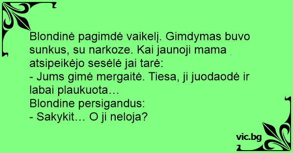 Blondinė pagimdė vaikelį. Gimdymas buvo sunkus, su narkoze. Kai jaunoji mama atsipeikėjo sesėlė jai tarė: