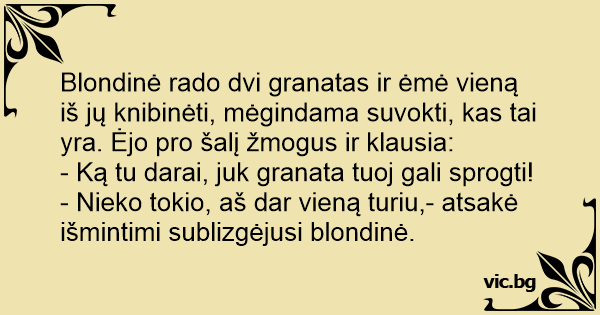 Blondinė rado dvi granatas ir ėmė vieną iš jų knibinėti, mėgindama suvokti, kas tai yra. Ėjo pro šalį žmogus ir klausia: