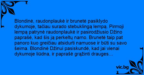 Blondinė, raudonplaukė ir brunetė pasiklydo dykumoje, tačiau surado stebuklingą lempą. Pirmoji lempą patrynė raudonplaukė ir pasirodžiusio Džino paprašė, kad šis ją perkeltų namo. Brunetė taip pat panoro kuo greičiau atsidurti namuose ir būti su savo šeima. Blondinė Džinui pasiskundė, kad jai vienai dykumoje liūdna, ir paprašė grąžinti drauges…