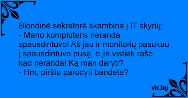 - Mano kompiuteris neranda spausdintuvo! Aš jau ir monitorių pasukau į spausdintuvo pusę, o jis vistiek rašo, kad neranda! Ką man daryti?