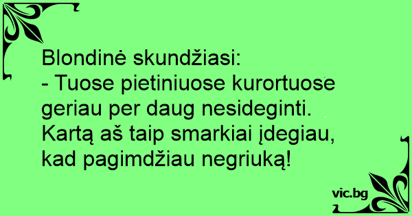 - Tuose pietiniuose kurortuose geriau per daug nesideginti. Kartą aš taip smarkiai įdegiau, kad pagimdžiau negriuką!