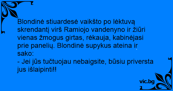 Blondinė stiuardesė vaikšto po lėktuvą skrendantį virš Ramiojo vandenyno ir žiūri vienas žmogus girtas, rėkauja, kabinėjasi prie panelių. Blondinė supykus ateina ir sako: