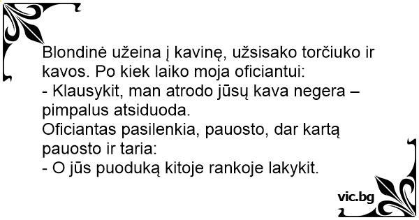 Blondinė užeina į kavinę, užsisako torčiuko ir kavos. Po kiek laiko moja oficiantui: