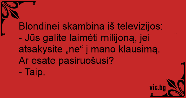 - Jūs galite laimėti milijoną, jei atsakysite „ne“ į mano klausimą. Ar esate pasiruošusi?