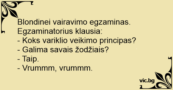 Blondinei vairavimo egzaminas. Egzaminatorius klausia: