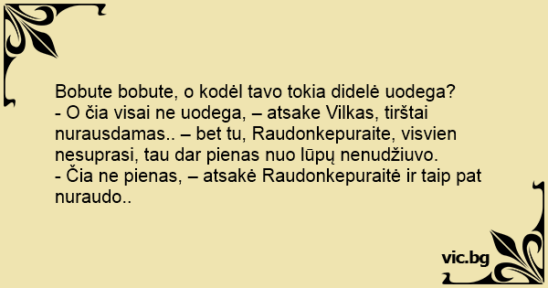 - O čia visai ne uodega, – atsake Vilkas, tirštai nurausdamas.. – bet tu, Raudonkepuraite, visvien nesuprasi, tau dar pienas nuo lūpų nenudžiuvo.