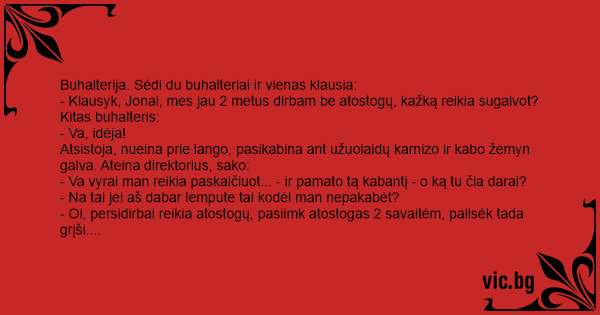 - Klausyk, Jonai, mes jau 2 metus dirbam be atostogų, kažką reikia sugalvot?