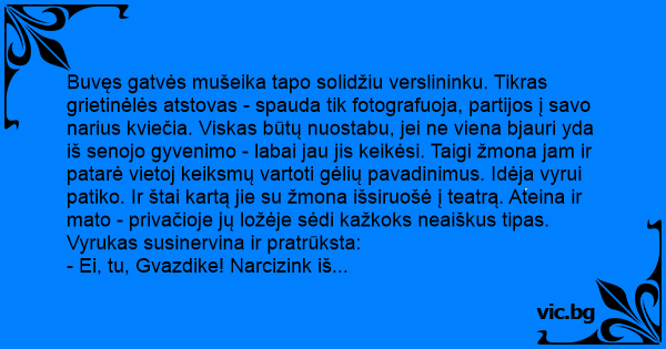 - Ei, tu, Gvazdike! Narcizink iš čia! Nes kaip užtulpinsiu, tai pilnas kelnes pripakalnutinsi!