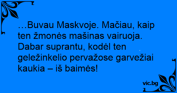 …Buvau Maskvoje. Mačiau, kaip ten žmonės mašinas vairuoja. Dabar suprantu, kodėl ten geležinkelio pervažose garvežiai kaukia – iš baimės!
