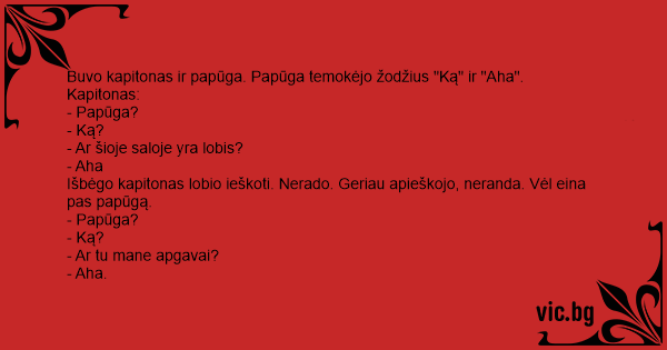 Buvo kapitonas ir papūga. Papūga temokėjo žodžius "Ką" ir "Aha".
