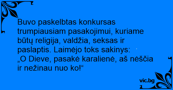 Buvo paskelbtas konkursas trumpiausiam pasakojimui, kuriame būtų religija, valdžia, seksas ir paslaptis. Laimėjo toks sakinys: