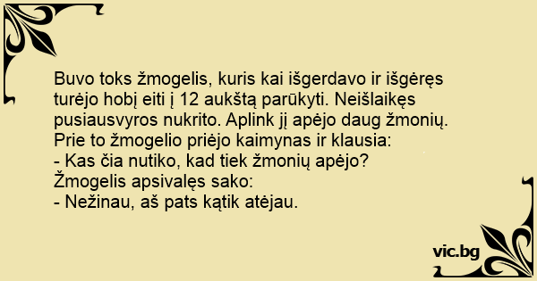 Buvo toks žmogelis, kuris kai išgerdavo ir išgėręs turėjo hobį eiti į 12 aukštą parūkyti. Neišlaikęs pusiausvyros nukrito. Aplink jį apėjo daug žmonių. Prie to žmogelio priėjo kaimynas ir klausia: