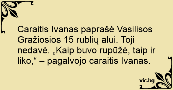 Caraitis Ivanas paprašė Vasilisos Gražiosios 15 rublių alui. Toji nedavė. „Kaip buvo rupūžė, taip ir liko,“ – pagalvojo caraitis Ivanas.