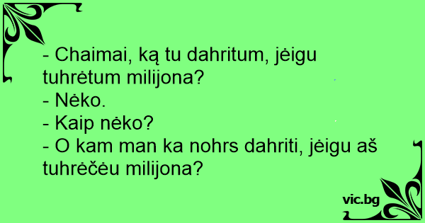 - O kam man ka nohrs dahriti, jėigu aš tuhrėčėu milijona?