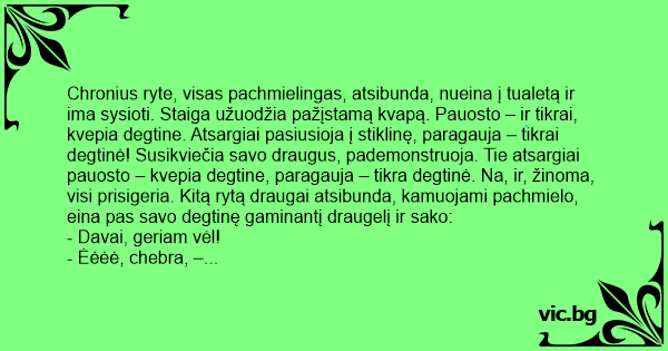 Chronius ryte, visas pachmielingas, atsibunda, nueina į tualetą ir ima sysioti. Staiga užuodžia pažįstamą kvapą. Pauosto – ir tikrai, kvepia degtine. Atsargiai pasiusioja į stiklinę, paragauja – tikrai degtinė! Susikviečia savo draugus, pademonstruoja. Tie atsargiai pauosto – kvepia degtine, paragauja – tikra degtinė. Na, ir, žinoma, visi prisigeria. Kitą rytą draugai atsibunda, kamuojami pachmielo, eina pas savo degtinę gaminantį draugelį ir sako: