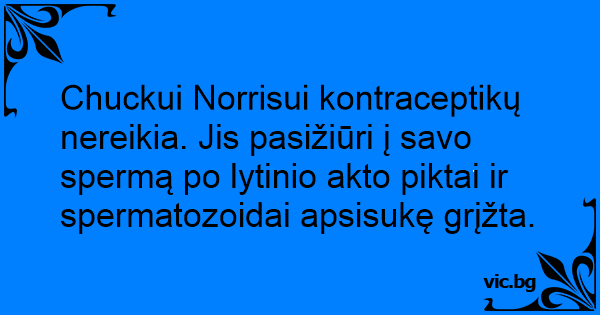 Chuckui Norrisui kontraceptikų nereikia. Jis pasižiūri į savo spermą po lytinio akto piktai ir spermatozoidai apsisukę grįžta.