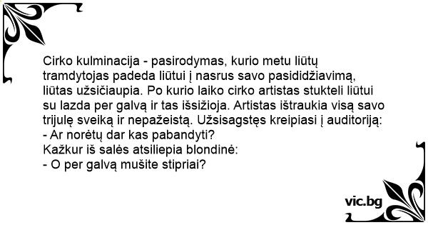Cirko kulminacija - pasirodymas, kurio metu liūtų tramdytojas padeda liūtui į nasrus savo pasididžiavimą, liūtas užsičiaupia. Po kurio laiko cirko artistas stukteli liūtui su lazda per galvą ir tas išsižioja. Artistas ištraukia visą savo trijulę sveiką ir nepažeistą. Užsisagstęs kreipiasi į auditoriją: