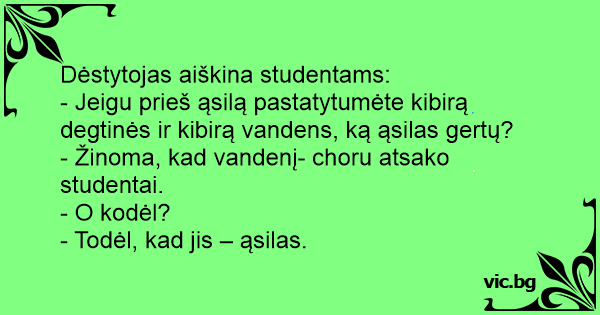 - Jeigu prieš ąsilą pastatytumėte kibirą degtinės ir kibirą vandens, ką ąsilas gertų?
