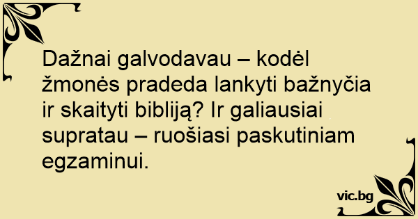 Dažnai galvodavau – kodėl žmonės pradeda lankyti bažnyčia ir skaityti bibliją? Ir galiausiai supratau – ruošiasi paskutiniam egzaminui.