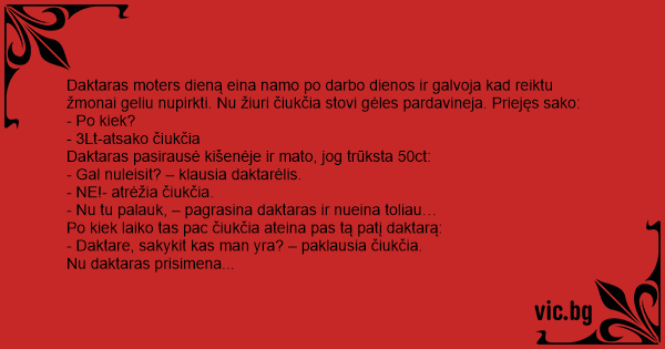 Daktaras moters dieną eina namo po darbo dienos ir galvoja kad reiktu žmonai geliu nupirkti. Nu žiuri čiukčia stovi gėles pardavineja. Priejęs sako: