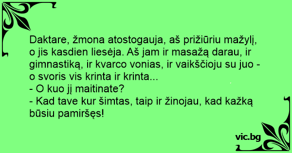 Daktare, žmona atostogauja, aš prižiūriu mažylį, o jis kasdien liesėja. Aš jam ir masažą darau, ir gimnastiką, ir kvarco vonias, ir vaikščioju su juo - o svoris vis krinta ir krinta...