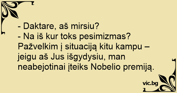 - Na iš kur toks pesimizmas? Pažvelkim į situaciją kitu kampu – jeigu aš Jus išgydysiu, man neabejotinai įteiks Nobelio premiją.