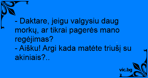 Medicul oftalmolog o sfatuieste pe o pacienta sa faca o Cura de morcovi pentru a-si imbunatati vederea. Sceptica, femeia intreaba: - Domnule doctor, sinteti sigur ca nu voi mai avea Probleme cu...