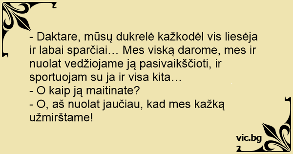 - Daktare, mūsų dukrelė kažkodėl vis liesėja ir labai sparčiai… Mes viską darome, mes ir nuolat vedžiojame ją pasivaikščioti, ir sportuojam su ja ir visa kita…