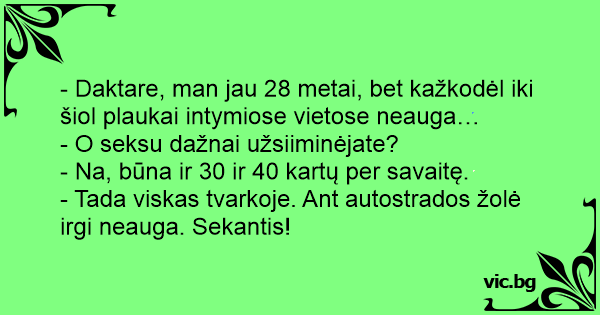 - Daktare, man jau 28 metai, bet kažkodėl iki šiol plaukai intymiose vietose neauga…