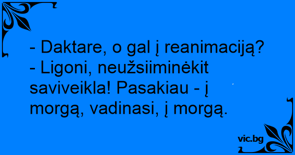 - Ligoni, neužsiiminėkit saviveikla! Pasakiau - į morgą, vadinasi, į morgą.