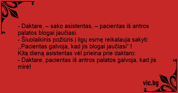 - Daktare, – sako asistentas, – pacientas iš antros palatos blogai jaučiasi.