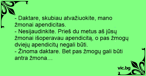 - Nesijaudinkite. Prieš du metus aš jūsų žmonai išoperavau apendicitą, o pas žmogų dviejų apendicitų negali būti.