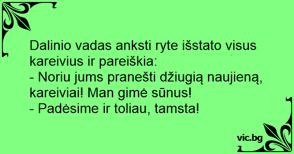 - Noriu jums pranešti džiugią naujieną, kareiviai! Man gimė sūnus!