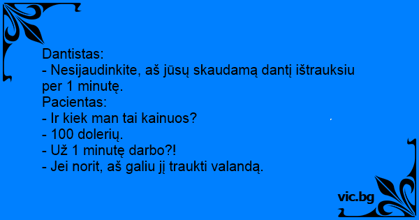 Вадење заб En el dentista: - Tengo que extraerle el diente adolorido, pero no te preocupes solo tomará unos cinco minutos. - ¿Y cuánto costará? - 90 euros - ¡90 euros por solo unos minutos de trabajo! - ¡Puedo extraerlo muy lentamente si quiere! Шотландец отива при зъболекар. - Колко ще ми струва ваденето на зъба? - 50 долара - 50 ДОЛАРА ЗА 20 СЕКУНДИ?! - Ако искате ще го извадя много бавно. Chez le dentiste: - Docteur, combien ça va me coûter pour me faire retirer cette dent? - 600 frs - Quoi?! 600 frs pour quelques minutes de travail??? - Je peux l'extraire très lentement si vous... Skotten var hos tandläkaren. - Jag måste dra ut en tand som är dålig säger tandläkaren. - Vad kostar det, frågar skotten oroligt. - Ettusensjuhundra. - Så mycket för bara några sekunders... U dentysty: - Ile kosztuje ekstrakcja zęba? - 50 złotych. - 50 złotych za kilka minut pracy?! - Mogę wyrywać powoli, jeśli Pan chce. Patient- Dr. How much it will cost me to extract my two teeth? Dentist- $300 US dollars Patient- How much time it will take? Dentist- Five minutes Patient- Five minutes only & it's $300... O sujeito vai ao dentista: — Quanto custa uma extração? — 90 Reais! — 90 Reais? Só por alguns minutos de trabalho? — Se o senhor preferir, eu posso demorar bastante! - Ποσά θέλετε γιατρέ για να μου βγάλετε το χαλασμένο δόντι ? - 20.000 Δρ. - 20 χιλιάρικα για δουλεία λίγων λεπτών ? - Αν θέλετε μπορώ να κάνω την εξαγωγή παρά πολύ αργά. Пацієнт на прийомі у стоматолога: — Лікарю, скажіть, скільки коштує у Вас видалити зуб? — П'ятдесят доларів. — Три хвилини і п'ятдесят баксів ?! — Добре, добре, я буду висмикувати Ваш зуб три години! Hos Tandlægen. -  “Jeg bliver nødt til at hive din tand ud. Det kommer til at tage et par minutter.” -  “Og hvor meget skal jeg så betale for det?” -  “Det bliver 1.000 kroner.” -  “1.000 kroner... Hørt på tannlegekontoret: - Hva koster det å trekke denne tannen? - Det koster 150 kr. - 150 kroner? Og så er det gjort på bare 20 sekunder? - Tja… Jeg kan godt holde på lengre.