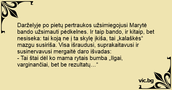 Darželyje po pietų pertraukos užsimiegojusi Marytė bando užsimauti pėdkelnes. Ir taip bando, ir kitaip, bet nesiseka: tai koją ne į ta skylę įkiša, tai „kalaškės“ mazgu susiriša. Visa išraudusi, suprakaitavusi ir susinervavusi mergaitė daro išvadas: