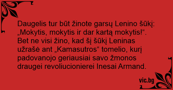 Daugelis tur būt žinote garsų Lenino šūkį: „Mokytis, mokytis ir dar kartą mokytis!“. Bet ne visi žino, kad šį šūkį Leninas užrašė ant „Kamasutros“ tomelio, kurį padovanojo geriausiai savo žmonos draugei revoliucionierei Inesai Armand.