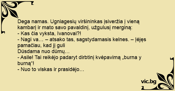 Dega namas. Ugniagesių viršininkas įsiveržia į vieną kambarį ir mato savo pavaldinį, užgulusį merginą: