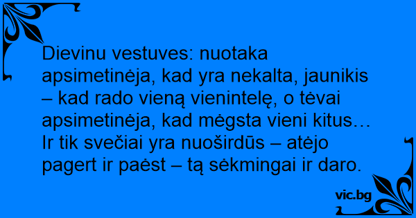 Dievinu vestuves: nuotaka apsimetinėja, kad yra nekalta, jaunikis – kad rado vieną vienintelę, o tėvai apsimetinėja, kad mėgsta vieni kitus… Ir tik svečiai yra nuoširdūs – atėjo pagert ir paėst – tą sėkmingai ir daro.