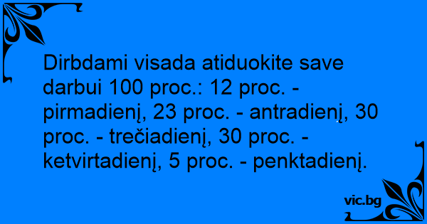 Dirbdami visada atiduokite save darbui 100 proc.: 12 proc. - pirmadienį, 23 proc. - antradienį, 30 proc. - trečiadienį, 30 proc. - ketvirtadienį, 5 proc. - penktadienį.